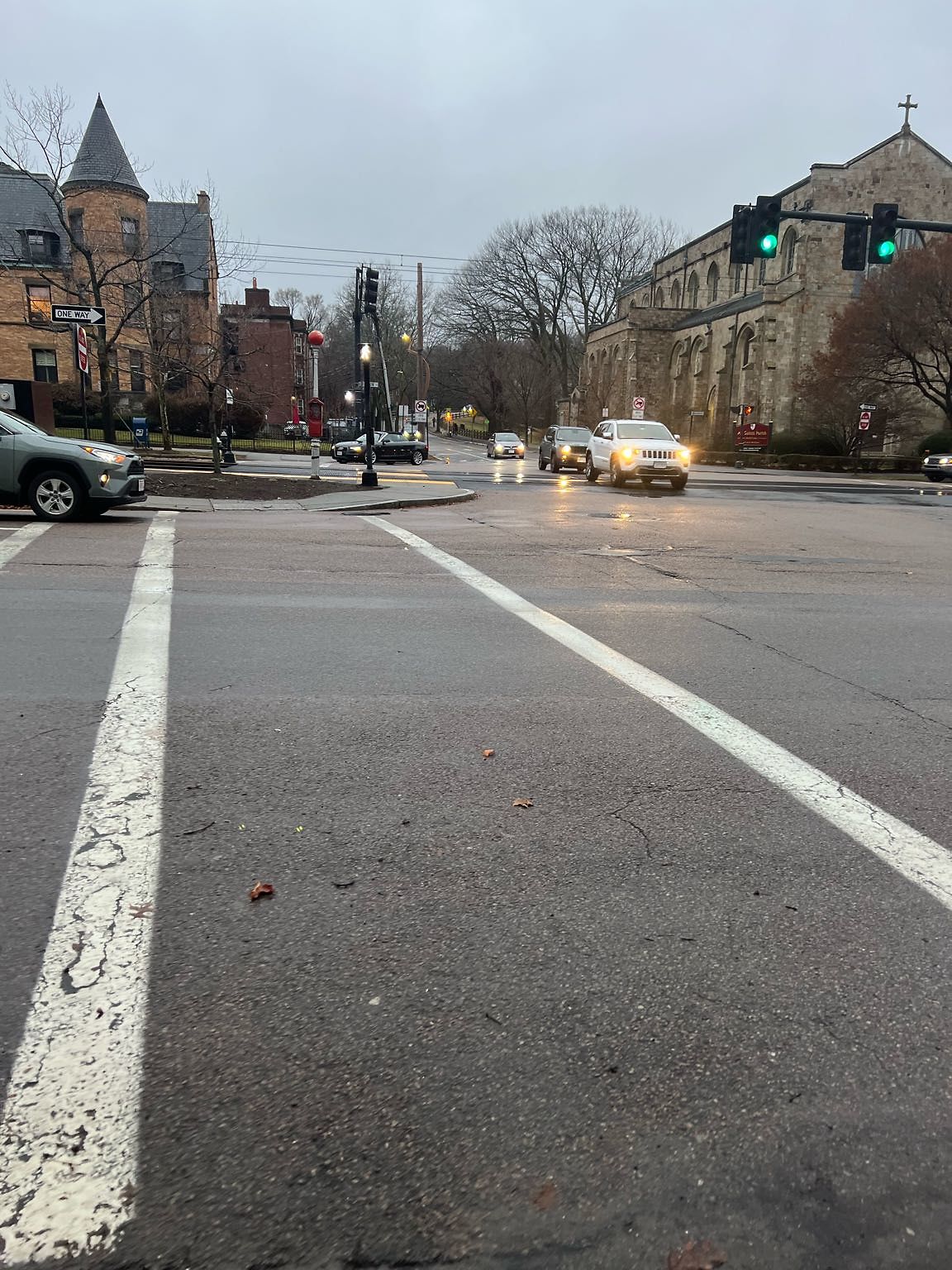 No crossing guard this morning. This intersection truly deserves 2 guards - the intersection by Wash St has two every morning, and the traffic pattern there is the same!