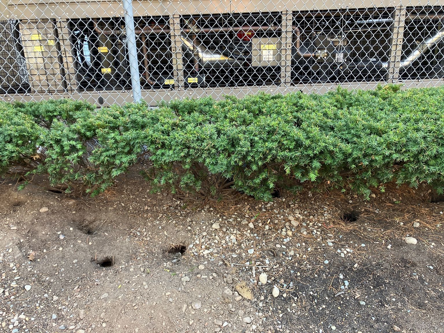 Adjacent to 10 Brookline Place West, next to HVAC units, quite a complex of burrows, presumably rat.