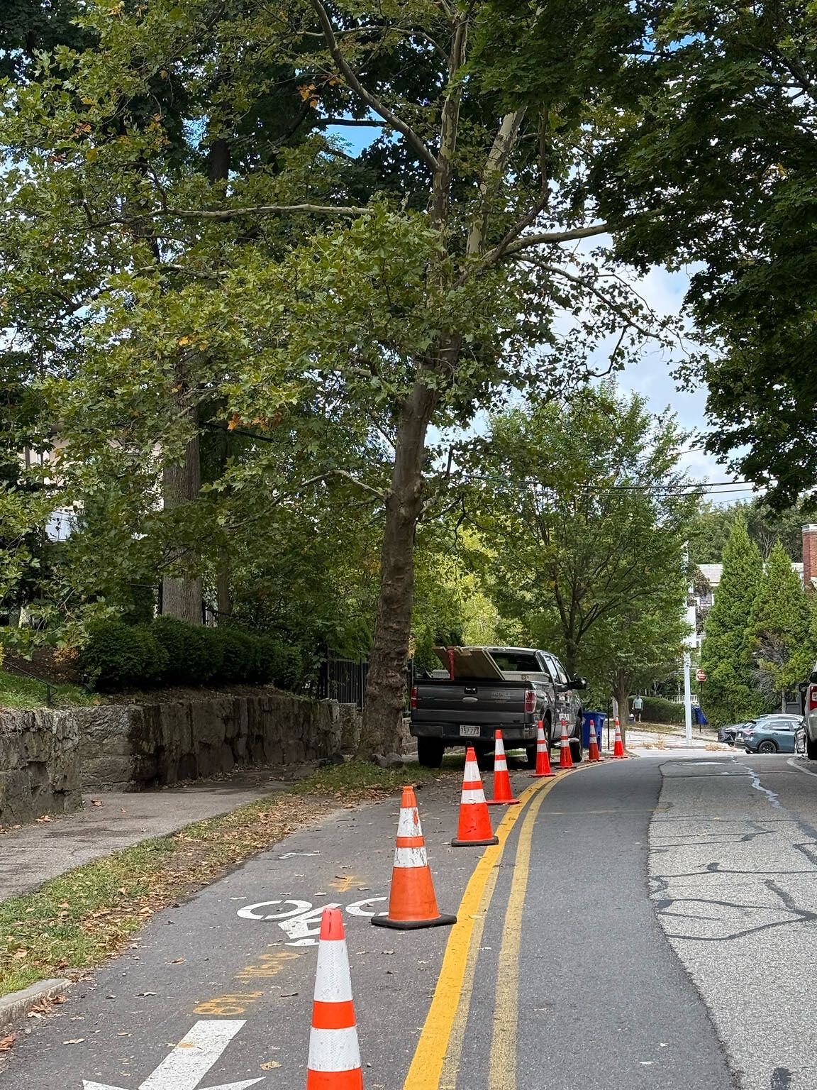 Construction vehicle parked in marked and separated bike lane.