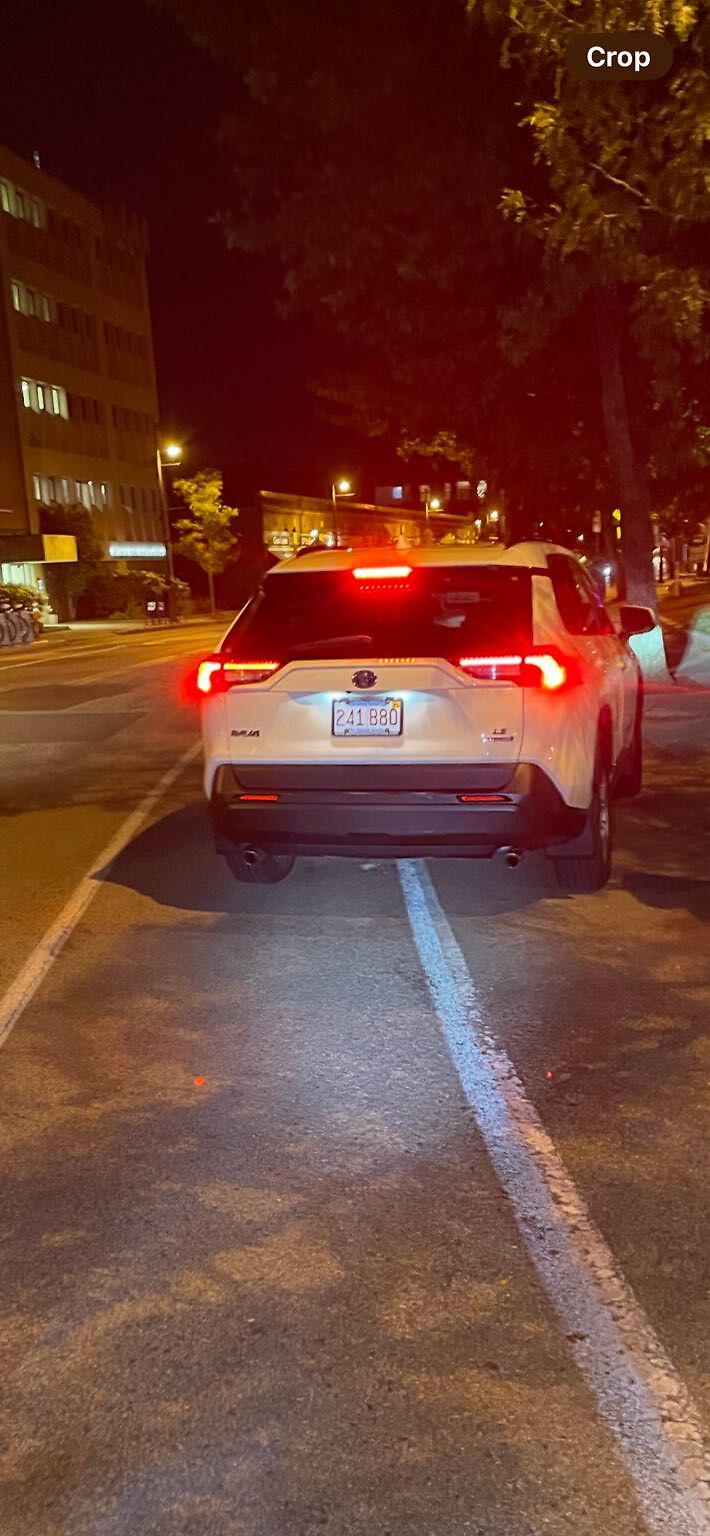 Car parked in well-marked Bike Lane violating Massachusetts Bike Lane law. Car is a white Toyota RAV4 with Massachusetts license plate 241 B80. October 1, 2025 at 10:42 pm.