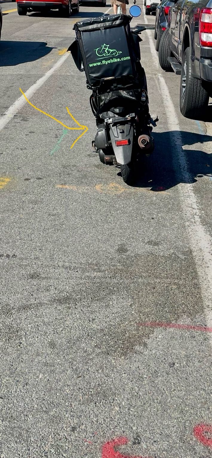 Moped parked illegally in well-marked Bike Lane at 12:35 pm on Tuesday, October 7, 2025 in front of 297 Harvard Street, Brookline. Plate obscured.
