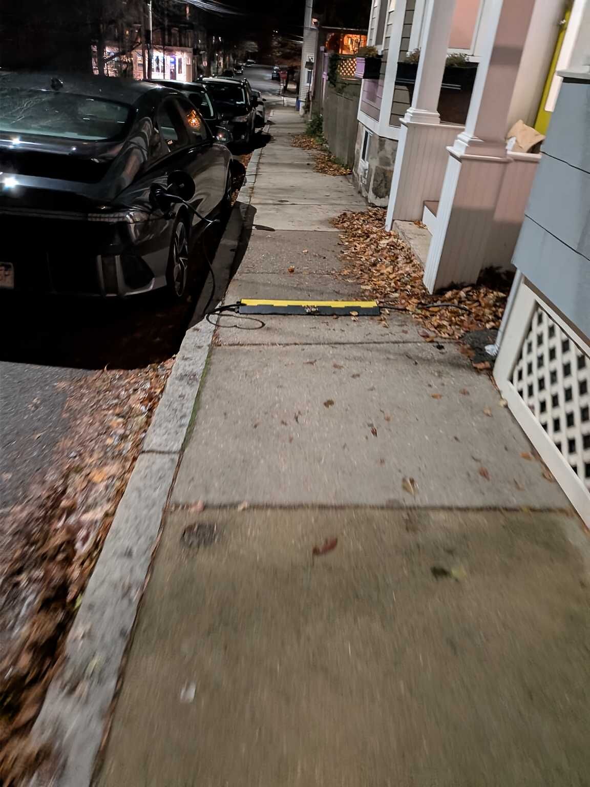 Tripped over this cord walking my dog. Absolutely diabolical to charge your car at night with a cord across the sidewalk at night.