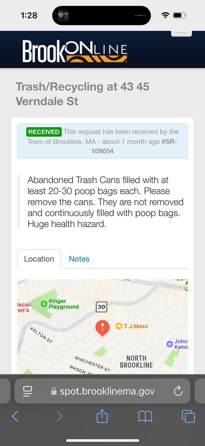 This has been reported already but not resolved. 4 large trash cans adjacent to sidewalk, all 4 full of dog poop bags
