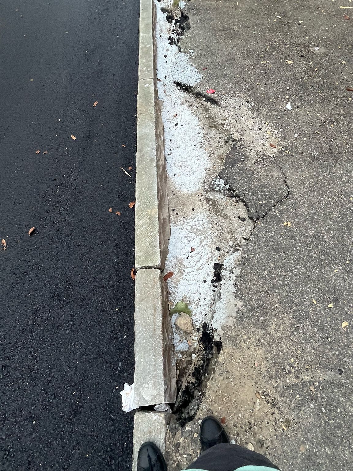 Hole on sidewalk area in parking lot on side of gym on sumner after paving
