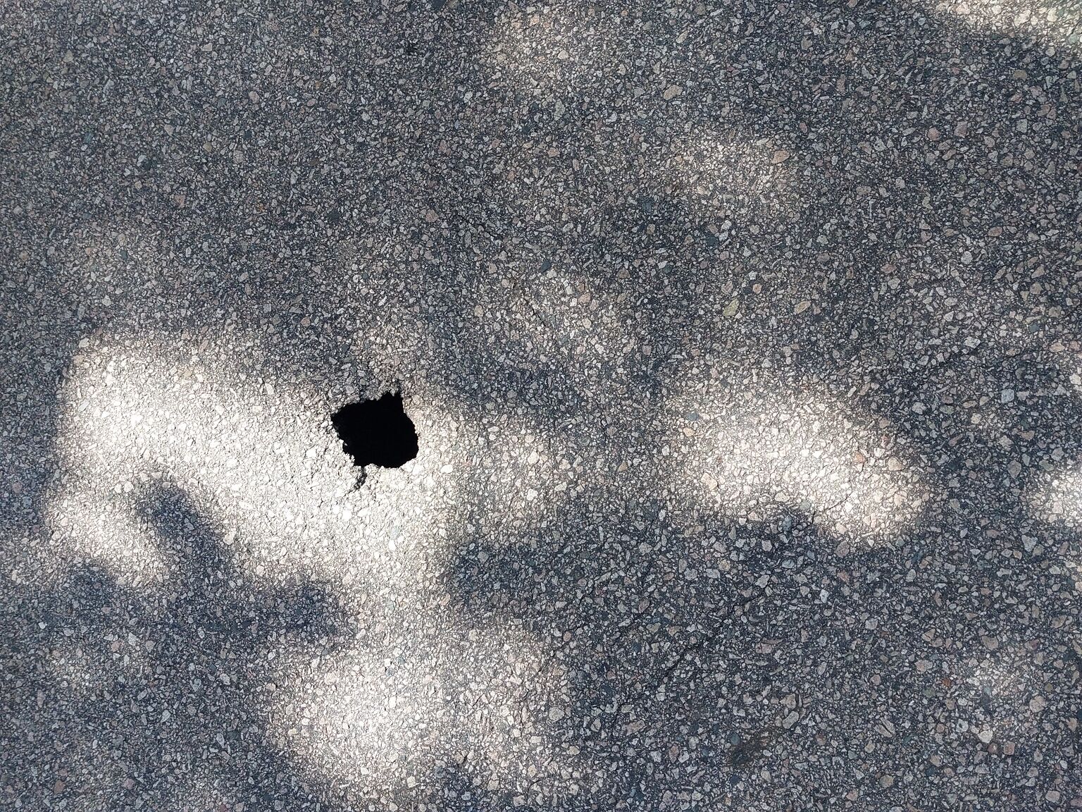 odd pothole, looks like some kind of sinkhole forming. can't see bottom of it from safe distance away. inside appears much larger than surface hole suggests (about 10-12in wide).