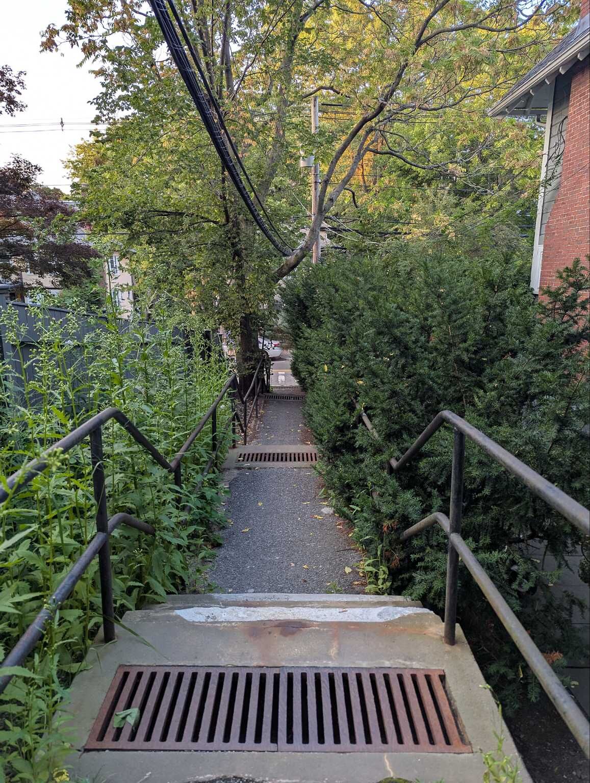 Your request has been received and is currently pending investigation by the Highway/Sanitation Department. Upon investigation, if the site has a sidewalk obstruction the property owner will be notified and will have 21 days to address the issue, per Town Sidewalk Obstruction Regulations. After those 21 days the location will be reviewed again. To follow up on your request, please email dpwenforcement@brooklinema.gov. -
