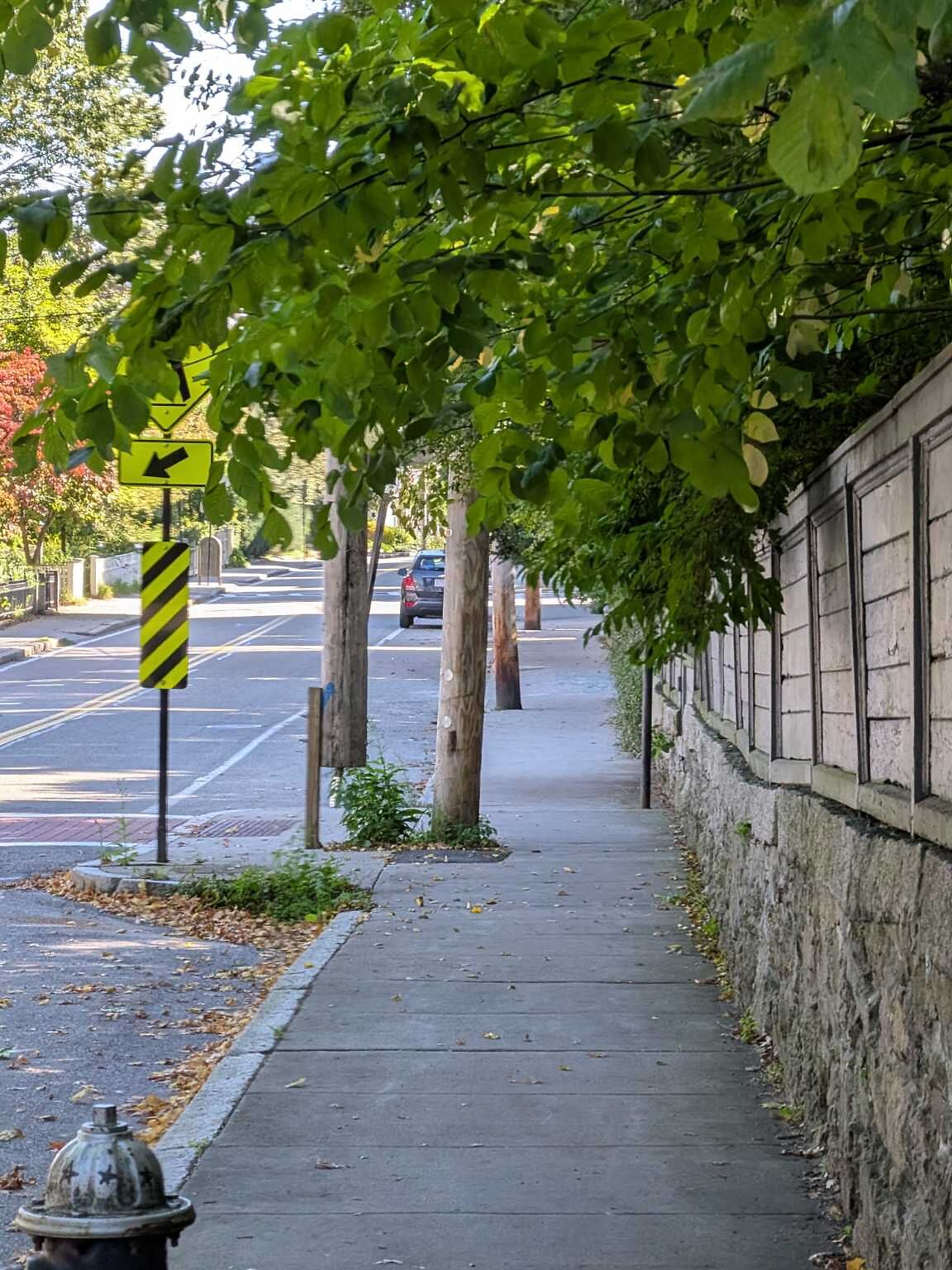 Multiple overgrown branches are blocking the sidewalk