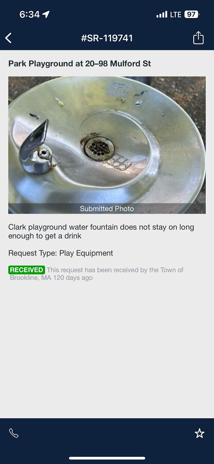 Made this request 120 days ago. Still not repaired. Water fountain at clark playground on Cypress street doesn't stay on long enough to get a drink 9/24