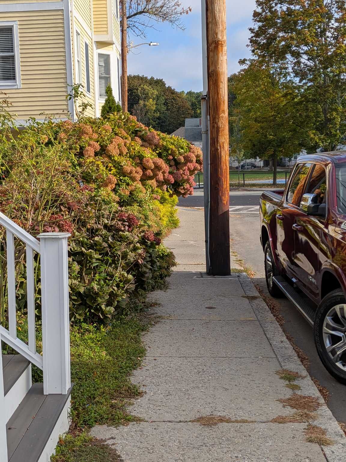 Your request has been received and is currently pending investigation by the Highway/Sanitation Department. Upon investigation, if the site has a sidewalk obstruction the property owner will be notified and will have 21 days to address the issue, per Town Sidewalk Obstruction Regulations. After those 21 days the location will be reviewed again. To follow up on your request, please email dpwenforcement@brooklinema.gov. -