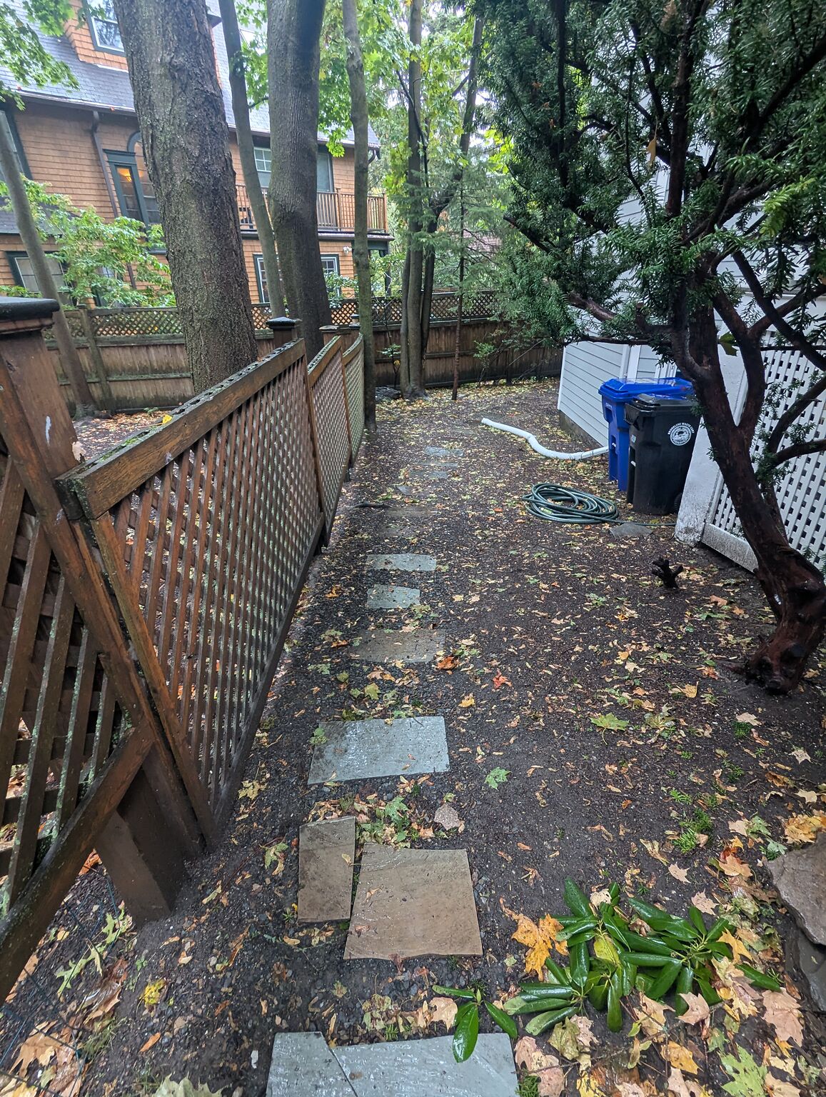 Dead squirrel on the side of our house. Near the trash bins.