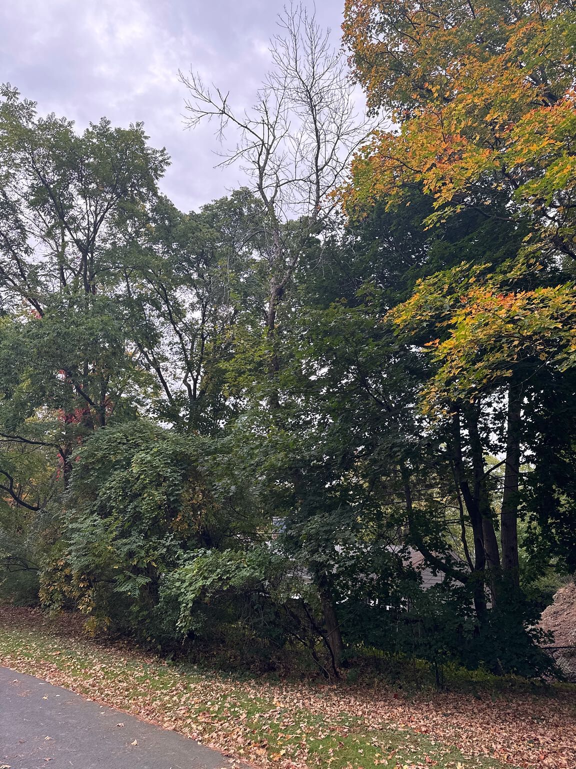 Backside of Wall Hills Cemetery, dead tree, just off the walkway, covered and vines