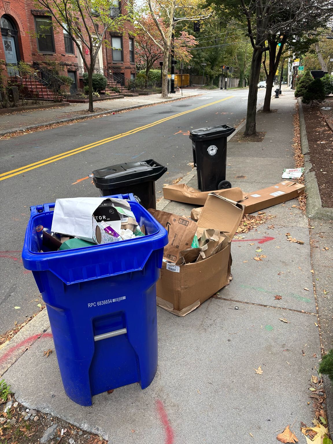 Trash bins and boxes blocking sidewalk, bins are out even though it's a Sunday (no trash collection)