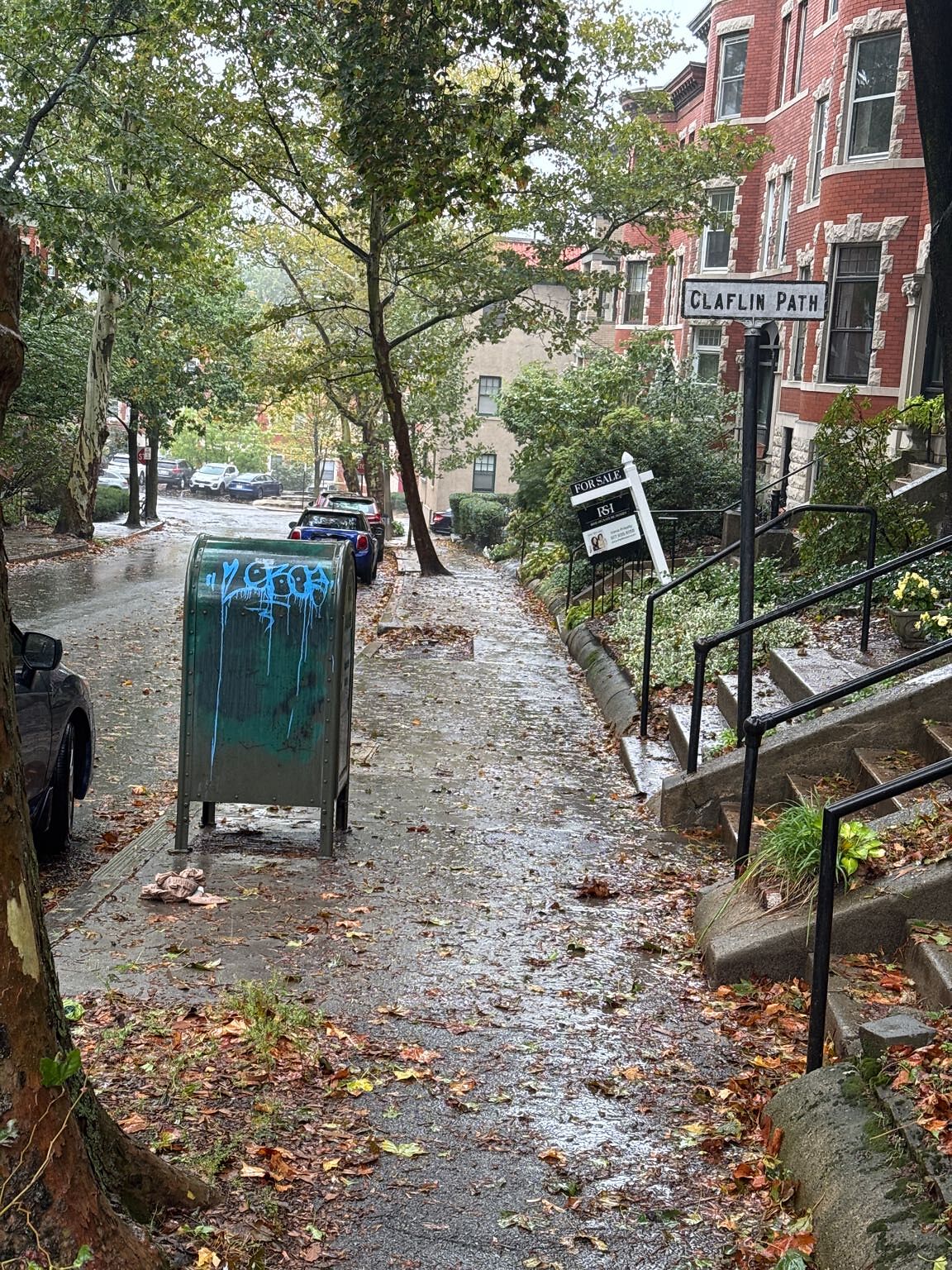 GRIFFILTHY on a green USPS carrier box off theA CLAFLIN Path