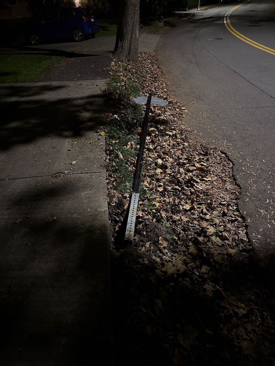 Street sign lying on side of street
