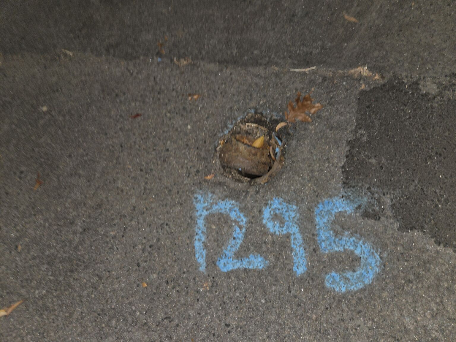 Damaged water main cap or valve sticking out in to the street. Exposing a small hole. If someone drives over it, they will get a flat tire. 615 Heath Street, where people park for the assisted living.