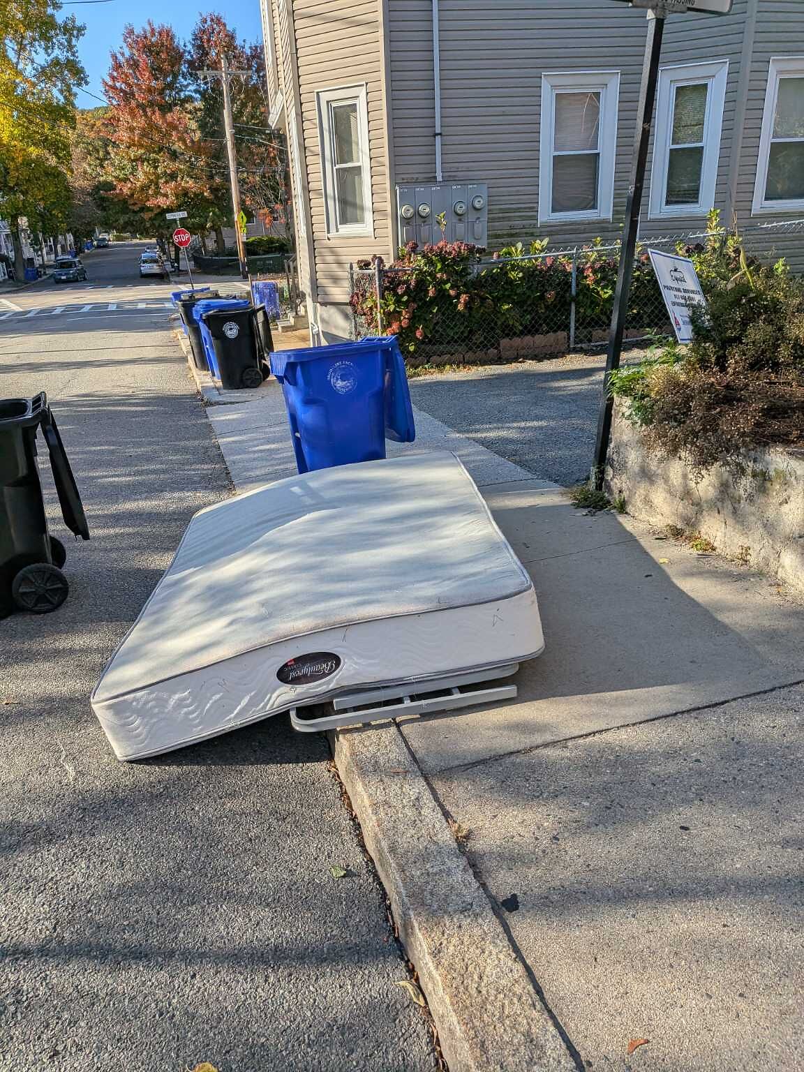 A mattress and bed frame that were put out with this place's trash are blocking the sidewalk.