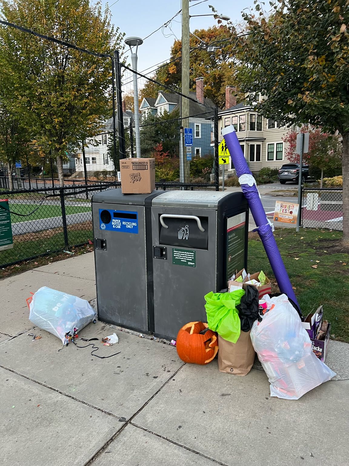 Garbage from the Ruffin Ridley School Halloween Party last night left at Big Belly on Stedman St between basketball courts and field