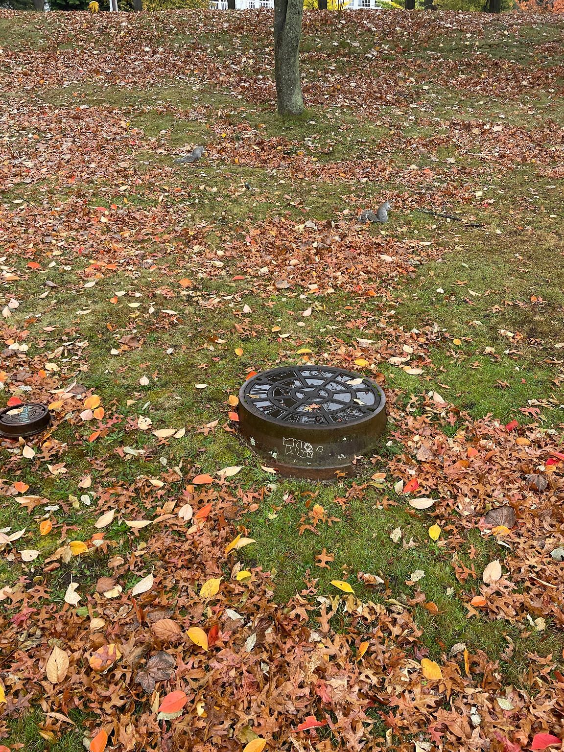 at the reservoir , between the path and the outer fence, directly across from the yellow house .