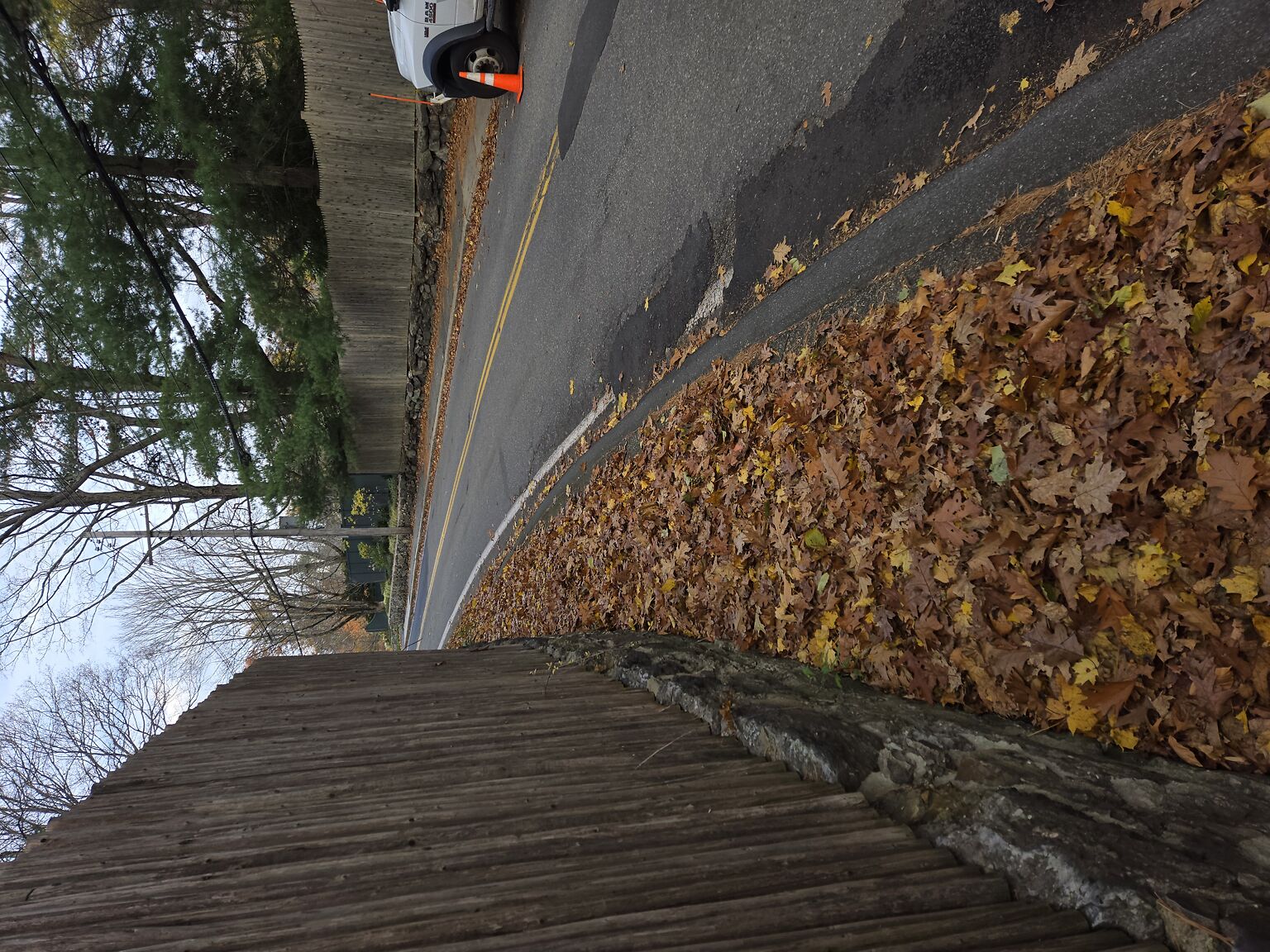 Leaves on Walkway. Might be a good time to clean up while the road is closed for utility work.