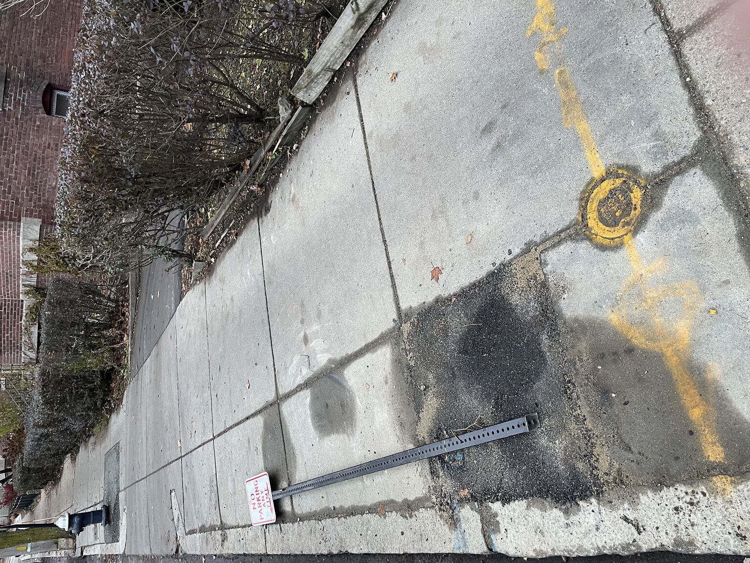 There was a town main water line break. The water department dug out the sign to do repair. It’s been left out. People are parking where the sign would have told them not to. It’s very dangerous.