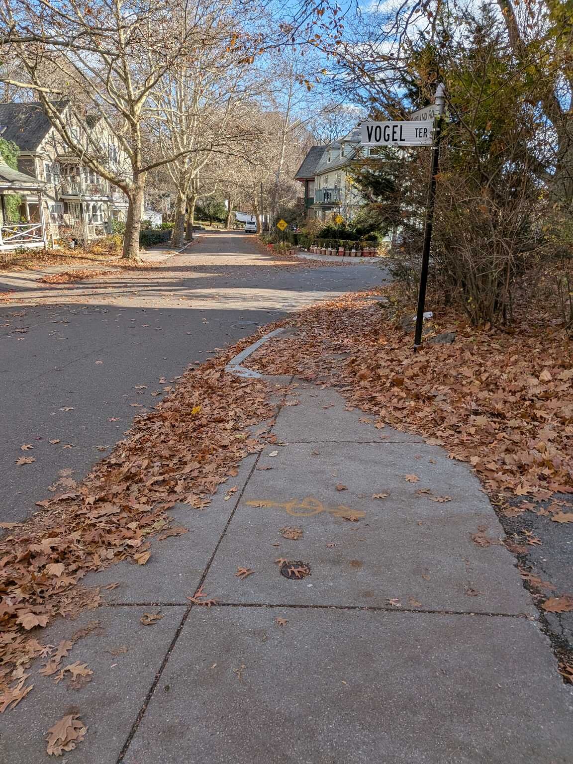 The sidewalk is covered with leaves which are hiding a broken section, a drop off onto some dirt and is very slippery to walk on.