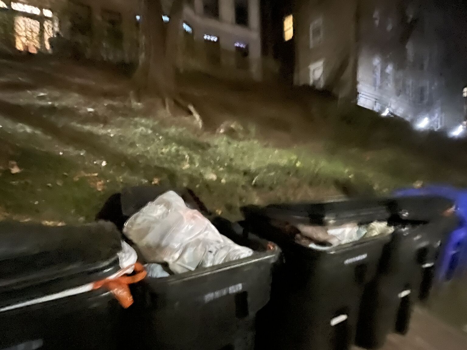 Overflowing trash bins with the tops off. Rats scurried from bins to dens under the trees on the slope.