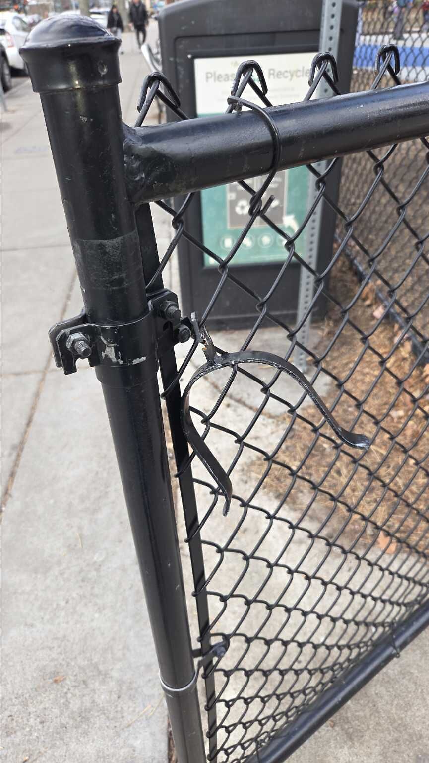 Damaged latch on playground gate in front of FRR school.