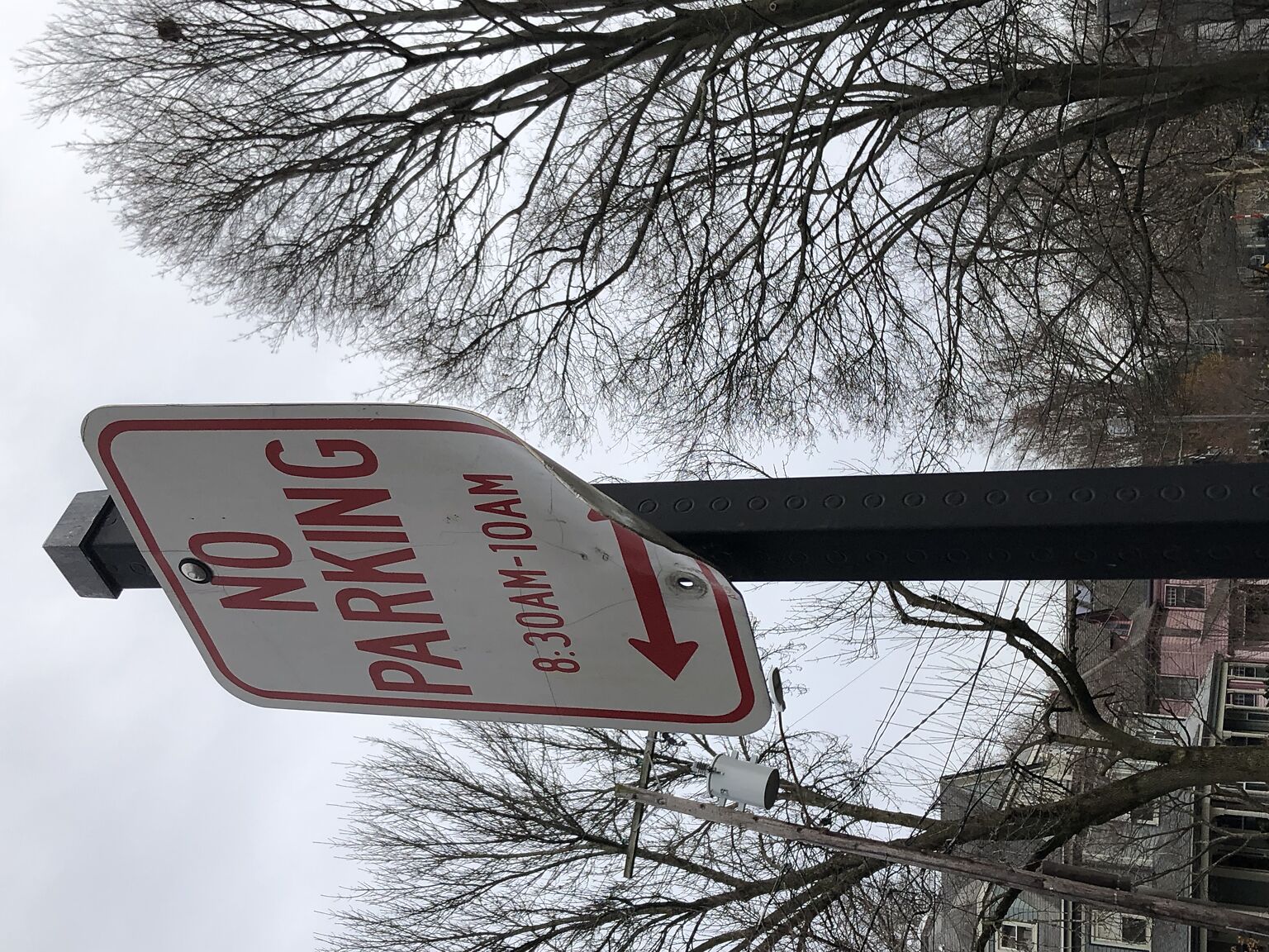 It seems the No Parking sign has been hit and is hanging by 1 bolt. Hardly an emergency but it will likely soon fall off, I think.