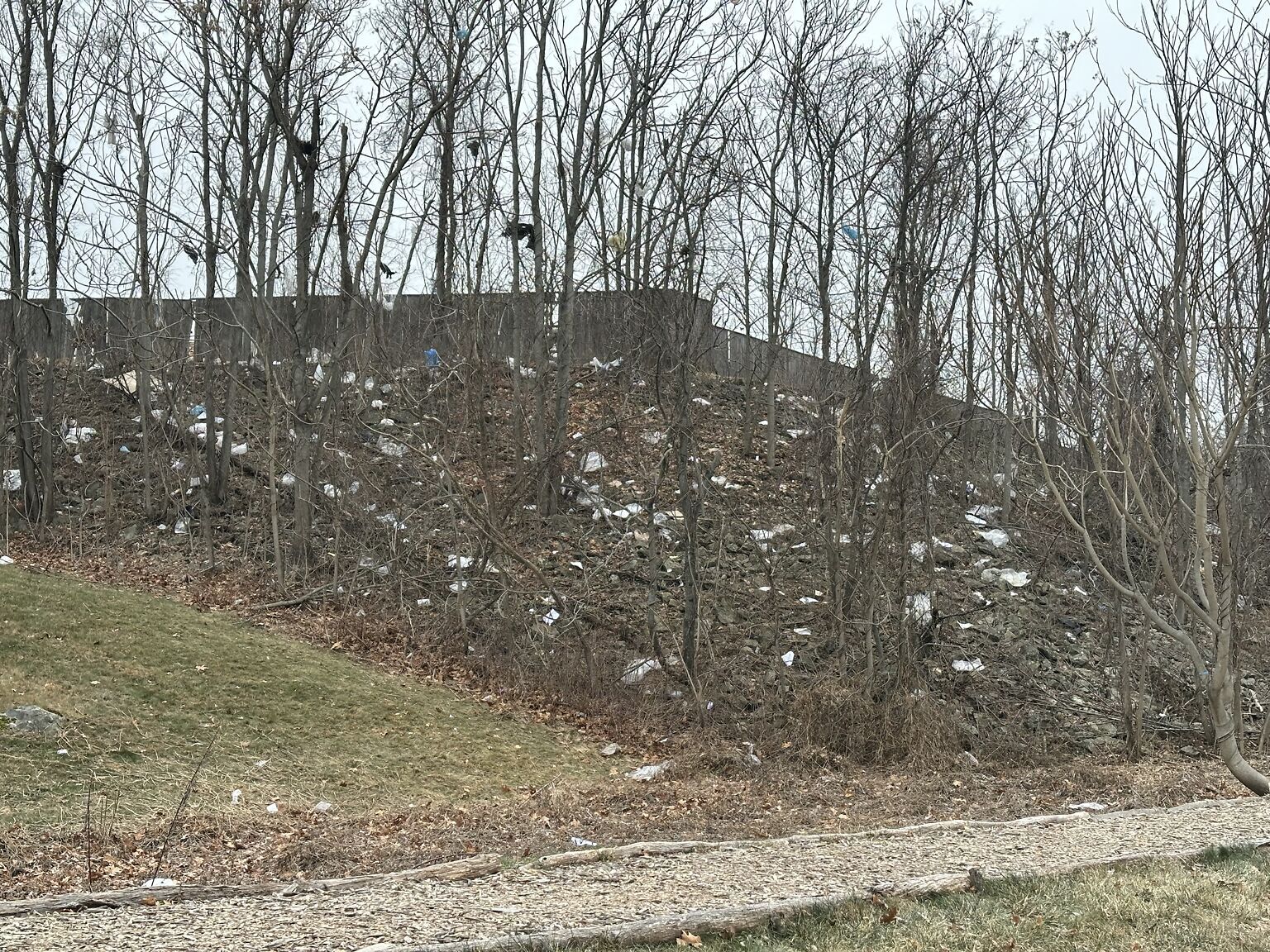 There is a significant amount of trash on the hill before the transfer station, in the trees and it has blown into the woods as well. Looks like a bag or 2 came loose and blew around everywhere