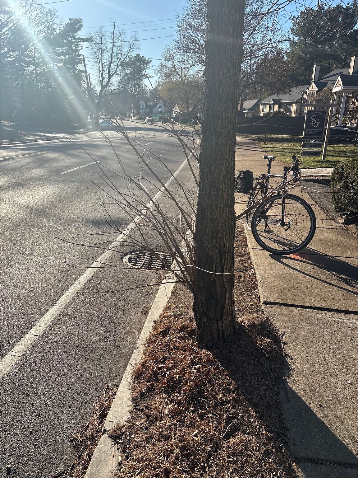 Prune tree sprouts growing into the very narrow used by bicycles ; opposite side of road from cemetery entrance