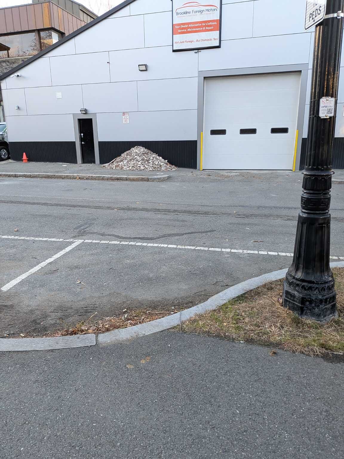 Huge pile of trash dumped on the sidewalk on the River Road side of the garage