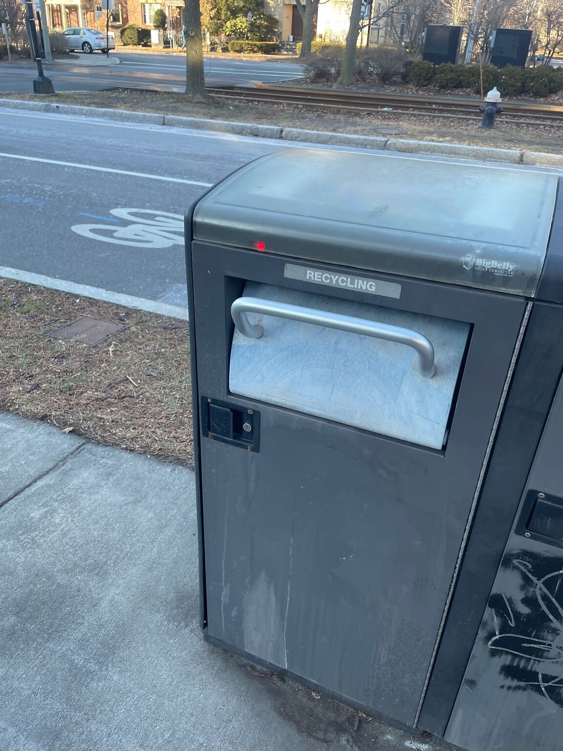 Right outside of Beacon Street Star Market. Near intersection of Beacon Street and Tappan Street. Overflowing recycling big belly