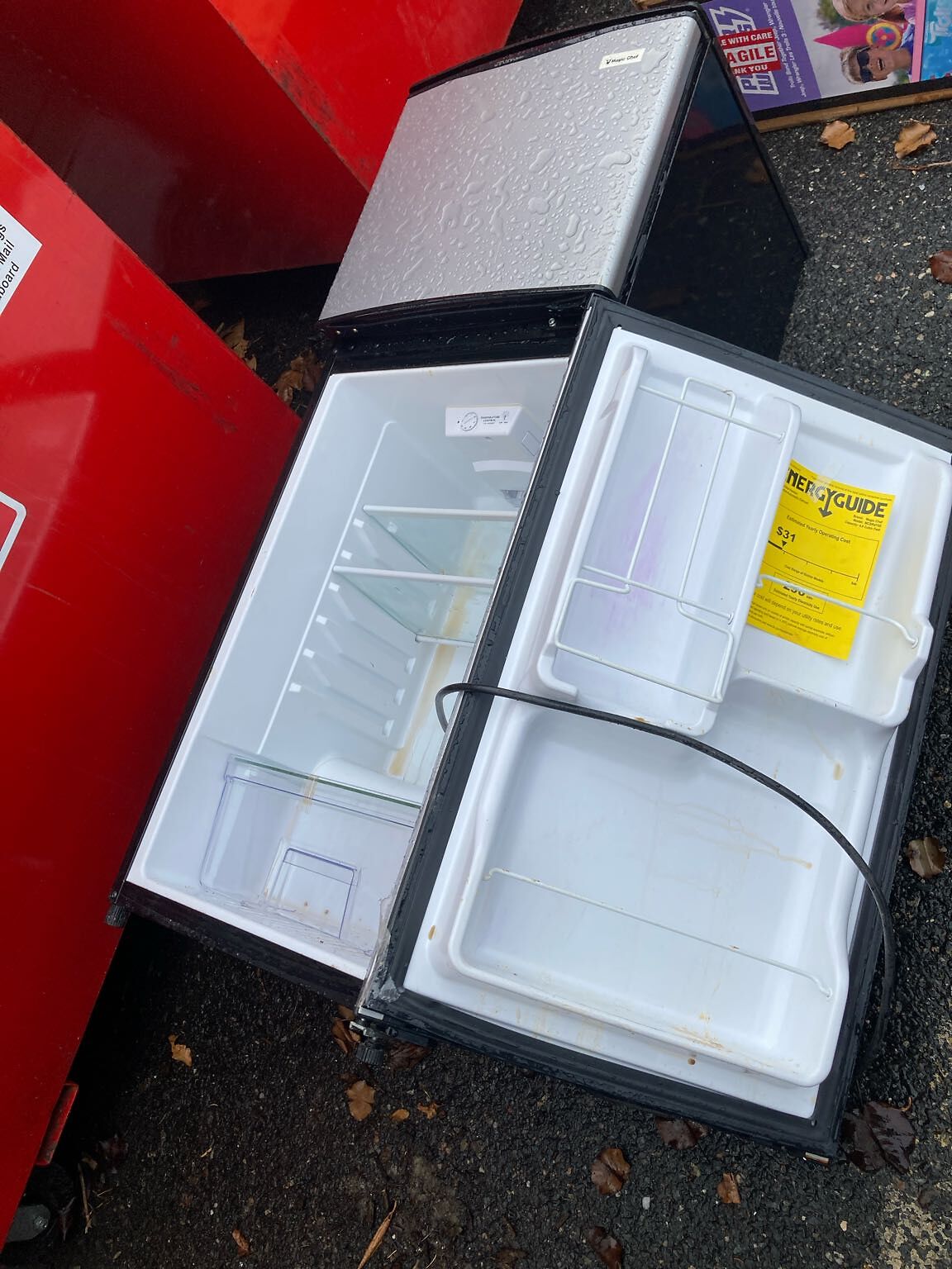 Small refrigerator next to dumpsters in back of 235 Cypress St. With door still attached looks like a health hazard to me.