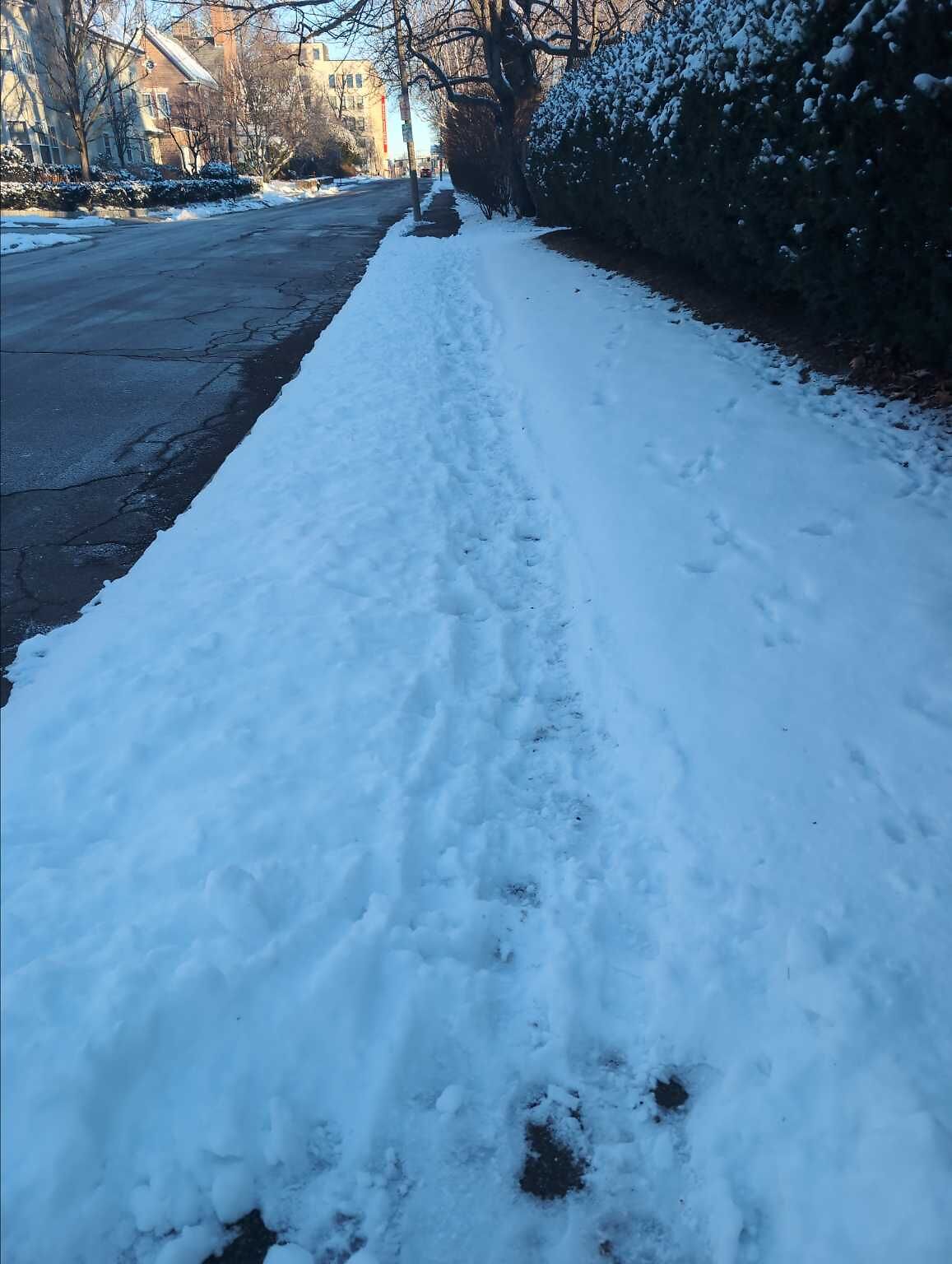 The location has been inspected, and the sidewalk obstruction has been cleared. If a violation was noted prior to the clearance, a ticket was issued to the property owner so they are aware of their responsibility of clearing the public way in future weather conditions. -