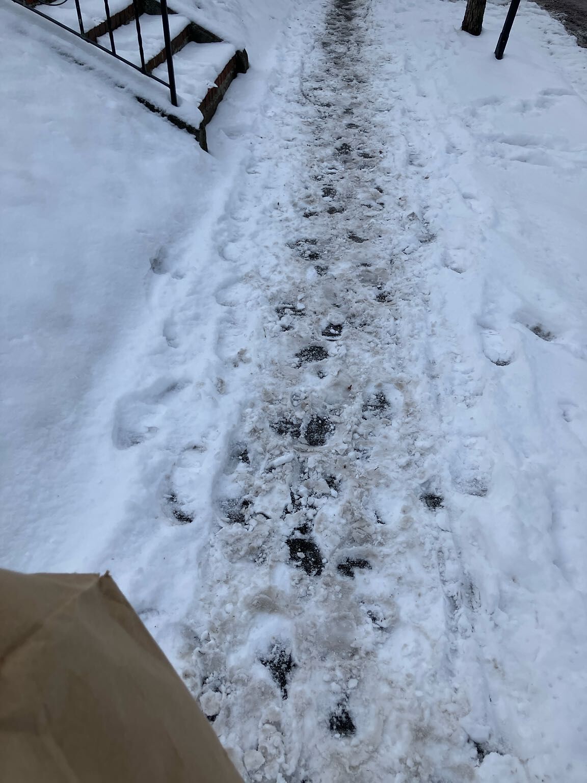 Looks like they went through with a shovel midway through the storm and never came back to clean up the rest. Lack of shoveling is glaringly obvious compared to the rest of the sidewalk.