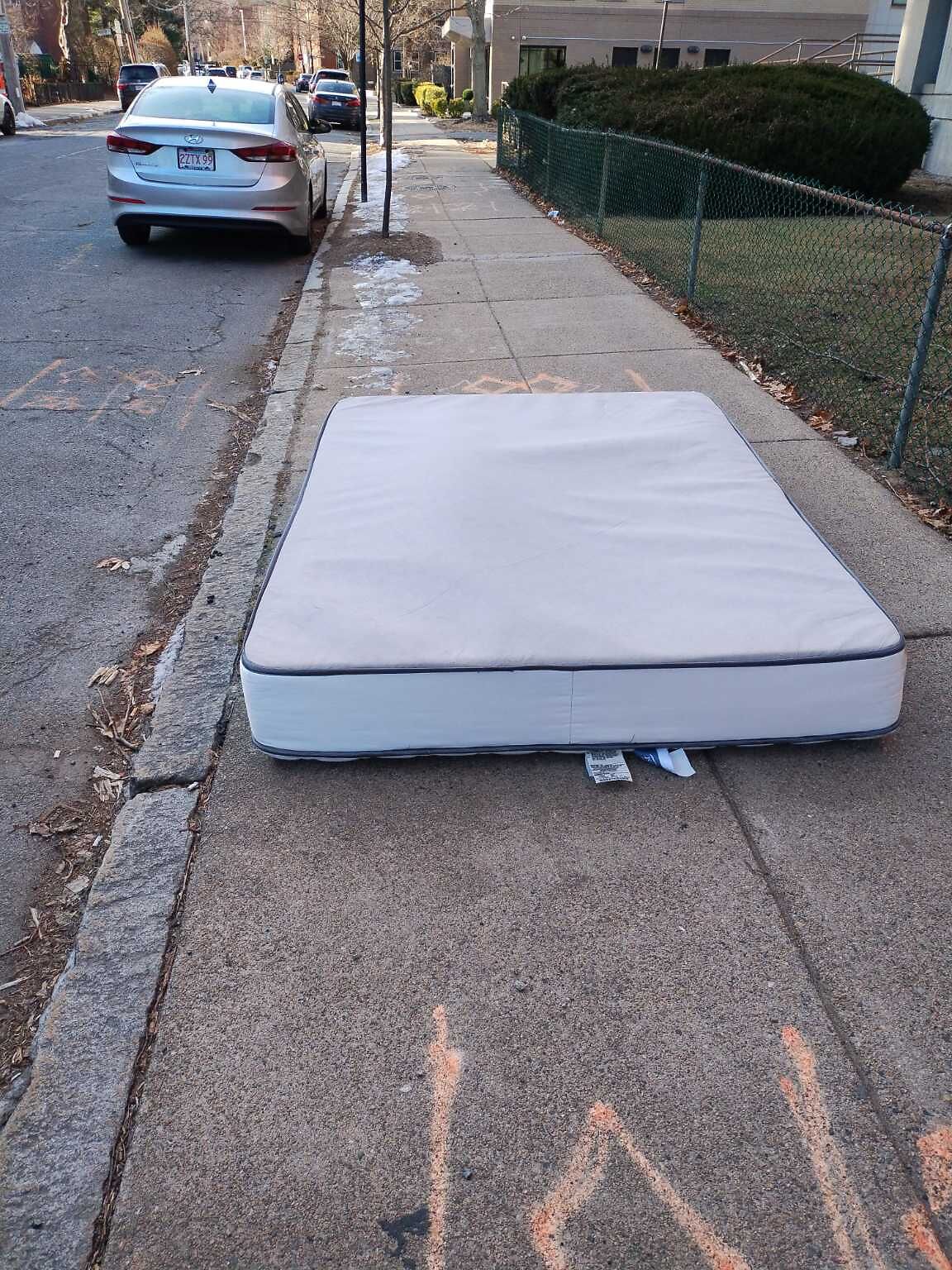 Mattress obstructing sidewalk in front of commercial building and across from construction site