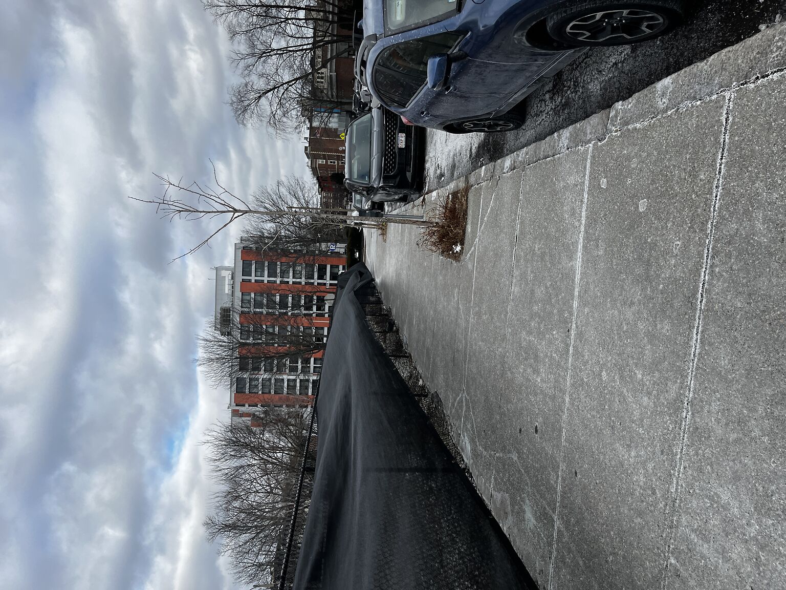 Unsecured fence tarp is flapping across sidewalk.