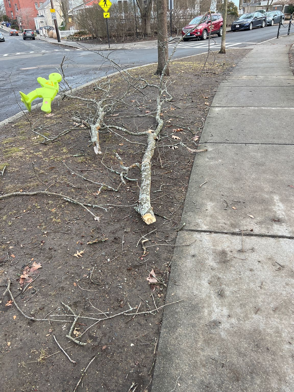 Large branch fallen near sidewalk and Emerson Garden entrance