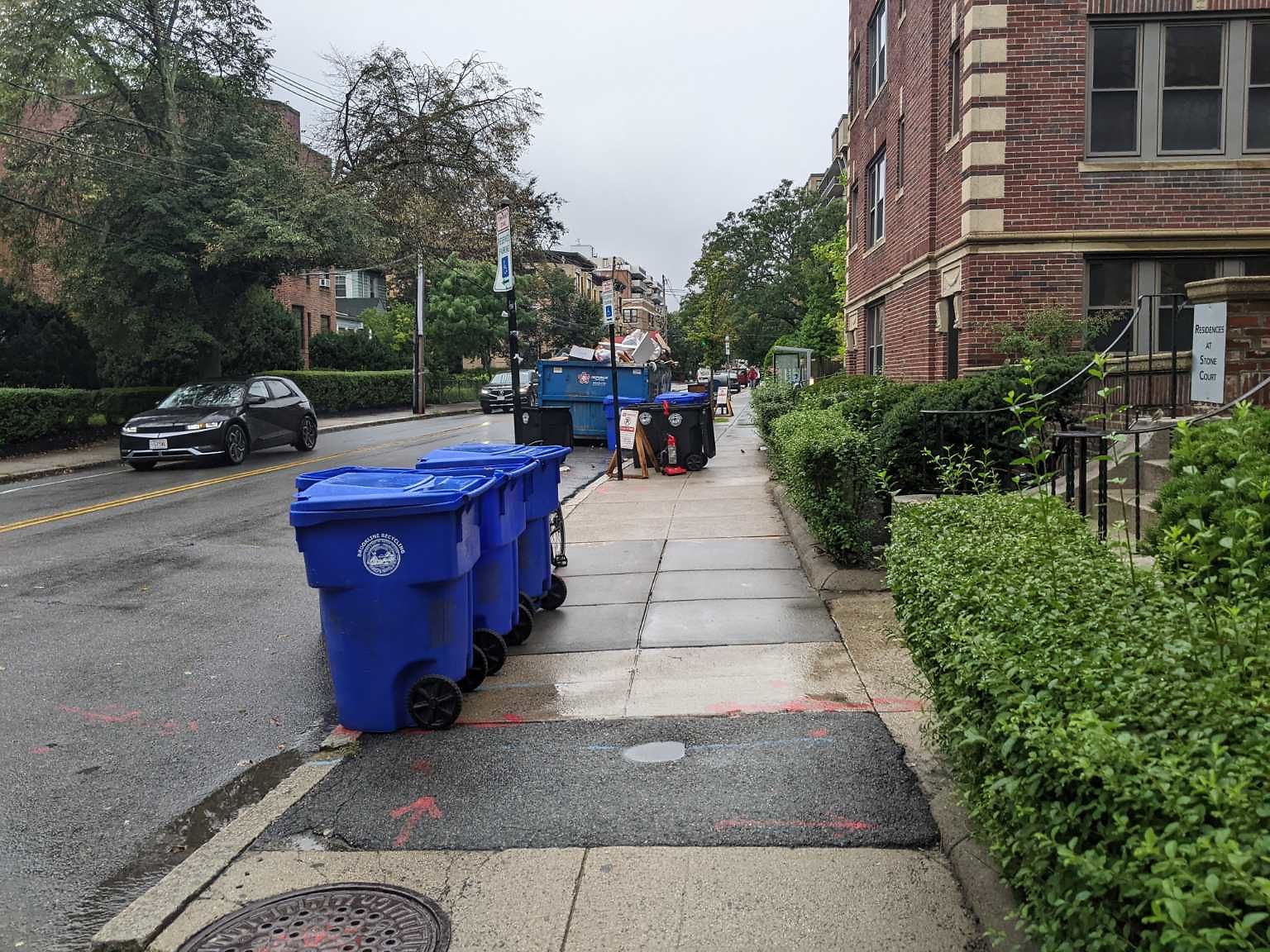 Empty trash barrels have been out overnight and the dumpster is overflowing.
