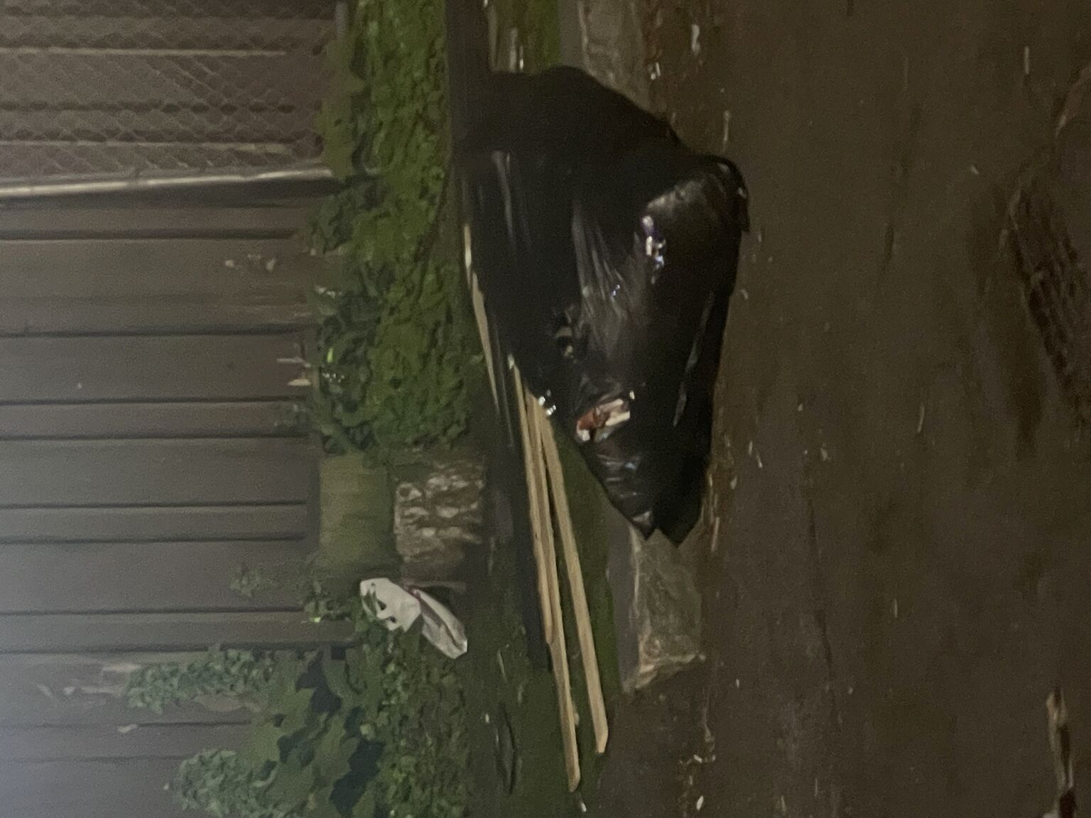 Trash dumped in Centre street across from cardboard recycling area by the trees. Rodents are ripping and feasting on contents in bag. Saw the rats
